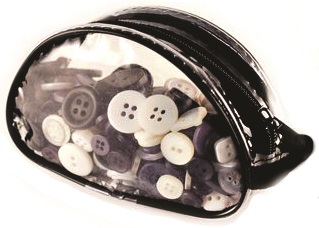 Assorted color and sized buttons in a plastic, zippered purse.