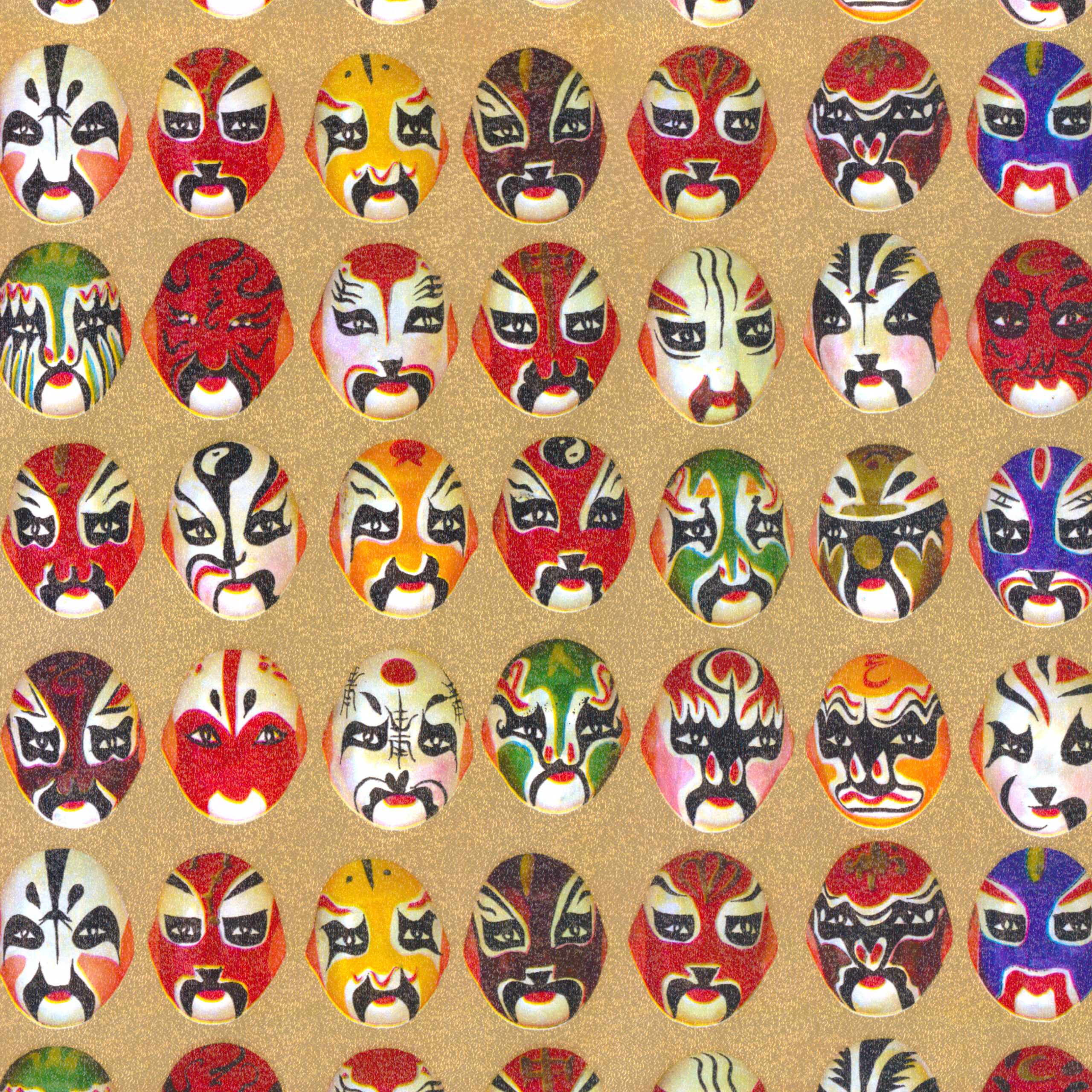 Sullivan Paper – Gift Wrap – Gold Japanese Masks (25′ x 26″)
